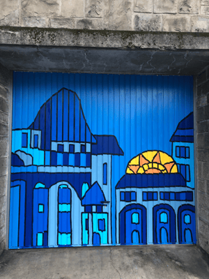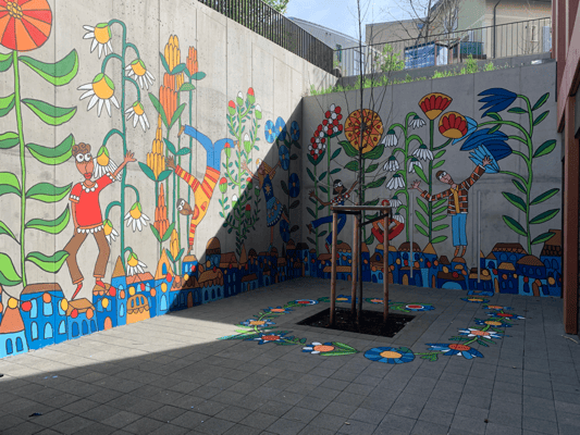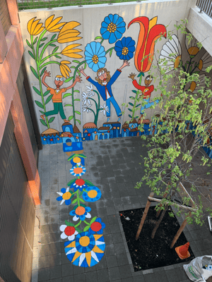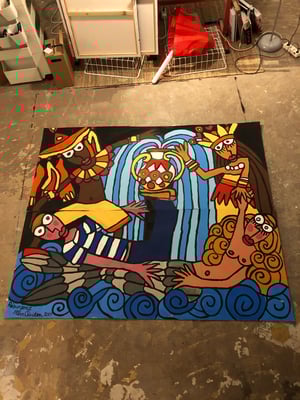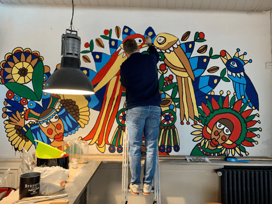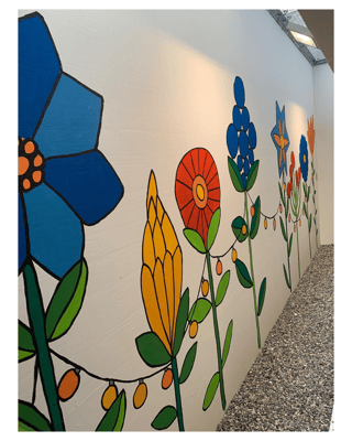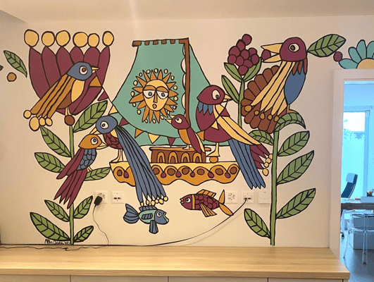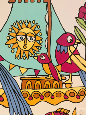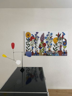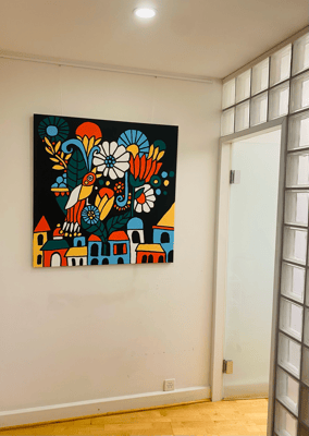 Des animaux, des maisons et quelques fleurs. Acrylique sur toiles. Exposition dans un cabinet de pédiatrie, Lausanne.