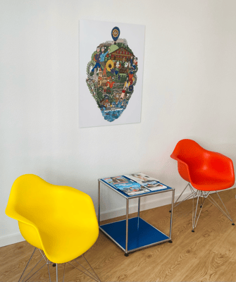 Dessins originaux mis sous vernis acrylique pour le cabinet du Dr Marc-Antoine Bornet à Lausanne.